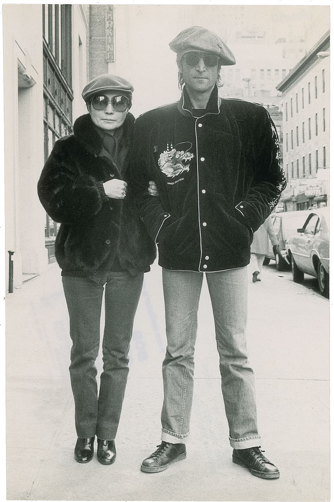Highly displayable original semi-glossy 6.25 x 9.75 silver gelatin photo by Bob Gruen of John Lennon and Yoko Ono posing together on 44th Street in New York in 1980. Reverse bears Gruen and Star File credit stamps. In very good to fine condition, with creasing to the upper and lower right corners. Accompanied by a certificate of authenticity from Tracks. A wonderful portrait taken in the year of Lennon's untimely death.