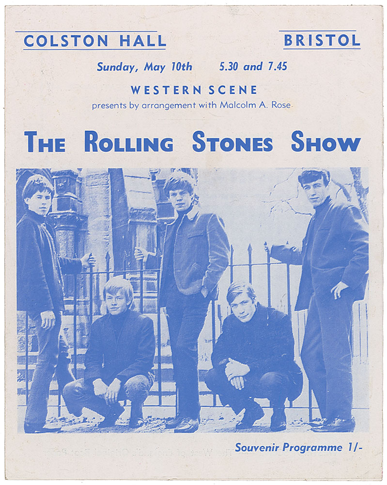 Rare vintage Western Scene program for a Rolling Stones concert at Colston Hall in Bristol, England, on May 10, 1964, two pages, 8 x 10, showing a blue-tinted image of the band on the front cover, with the inner pages listing acts like: “The Sensational Shouts, America’s ‘King of Rock’ Gene Vincent, The No Names, The ‘Lollipop’ Girl Millie, and the fabulous Rolling Stones.” In very good to fine condition, with light handling wear, and some creasing to the upper right corner. Accompanied by a certificate of authenticity from Tracks.