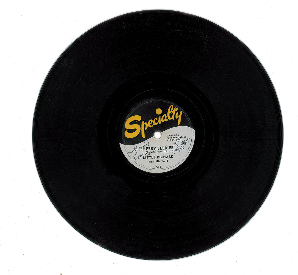 Specialty Records 78 RPM record for the single 'She's Got It / Heeby Jeebies' by Little Richard and His Band, signed on the B side label in black ballpoint, "God loves, Little Richard." In fine condition.