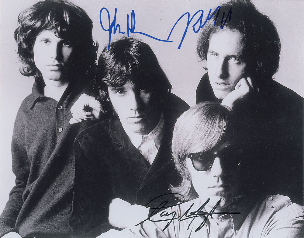 Satin-finish 14 x 11 studio portrait of The Doors, signed in blue felt tip by John Densmore and Robby Krieger, and in black felt tip by Ray Manzarek. In fine condition.