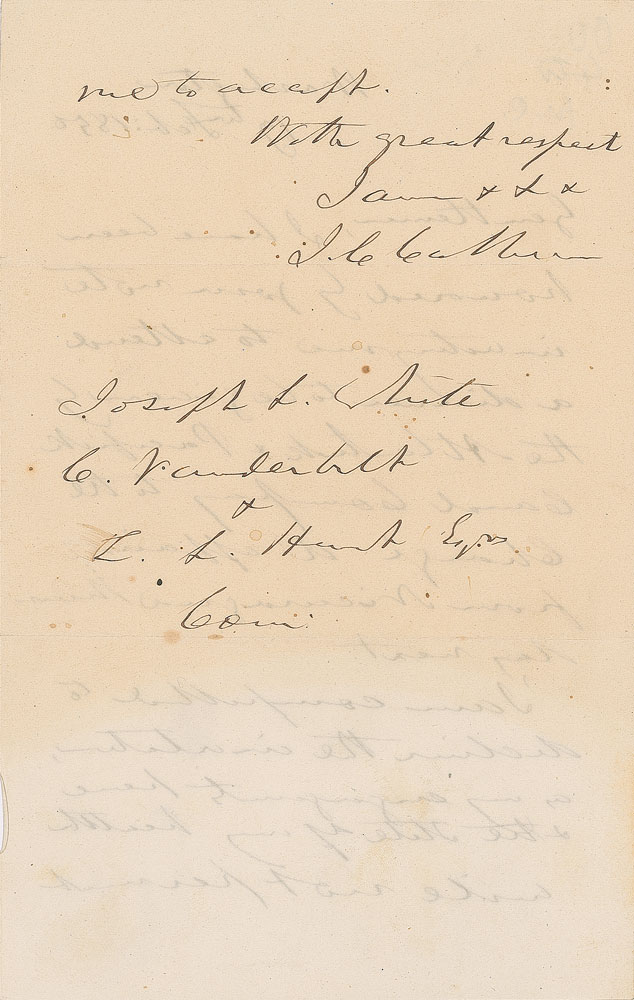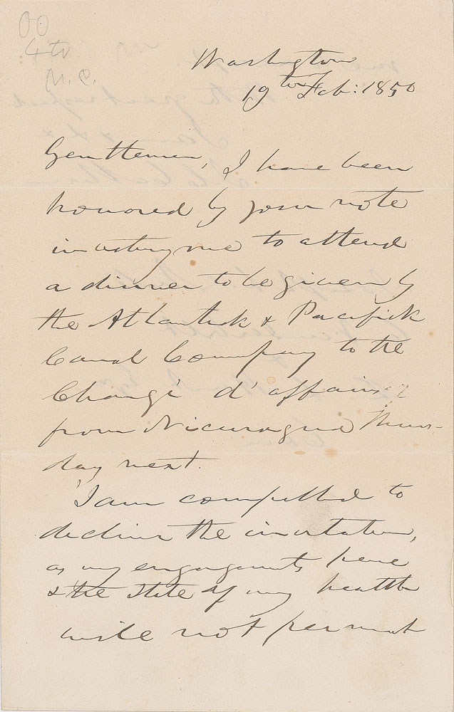 ALS signed “J. C. Calhoun,” one page both sides, 4.25 x 6.75, February 19, 1850. Letter to Joseph White, Cornelius Vanderbilt, and another officer of the Atlantic & Pacific Canal Company. In part: "I have been honoured by your note inviting me to attend a dinner to be given by the Atlantick & Pacifick Canal Company to the charge d'affairs from Nicaragua Thursday next. I am compelled to decline the invitation, as my engagements here & the state of my health will not permit me to accept." In fine condition.