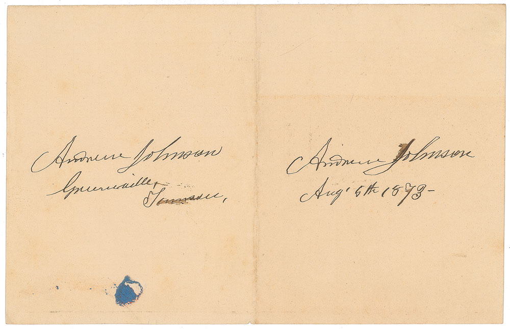 Unusual dual ink signature, "Andrew Johnson, Greeneville, Tennessee" and "Andrew Johnson, Aug. 5th 1873,” on a single off-white 7 x 4.5 sheet. In fine condition, with a central vertical fold, and a bit of blue seal remnant near the bottom edge.