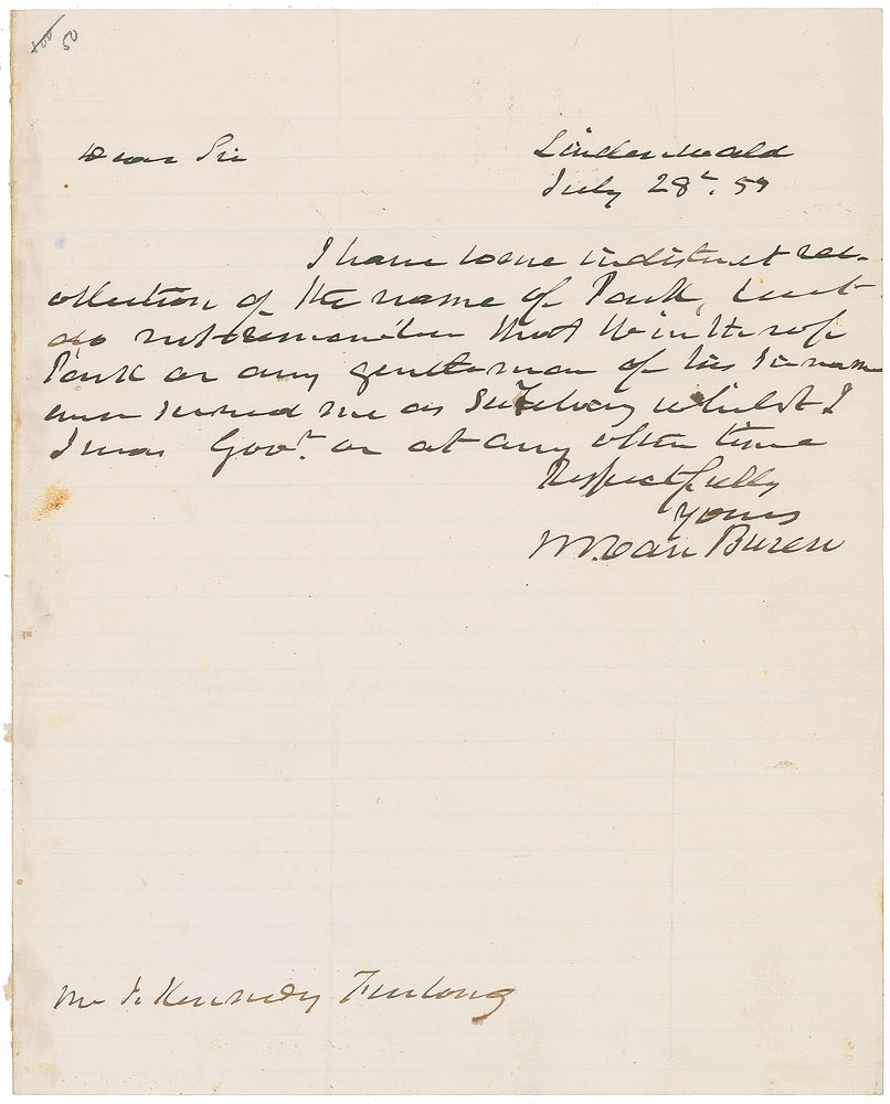 ALS signed “M. Van Buren,” one page, 7.75 x 9.75, July 28, 1859. Letter to Mr. J. Kennedy Furlong, written from his Lindenwald estate, in part: "I have some indistinct recollection of the name of Park." In fine condition, with some light staining along the left edge from old mounting remnants on the reverse.