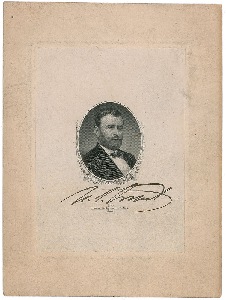 Outstanding official engraved portrait of Grant by the Bureau of Engraving & Printing, 4 x 5.5, boldly signed in ink, "U. S. Grant." Affixed to a 6 x 8 mount. In fine condition, with light overall soiling. Accompanied by a full letter of authenticity from JSA.