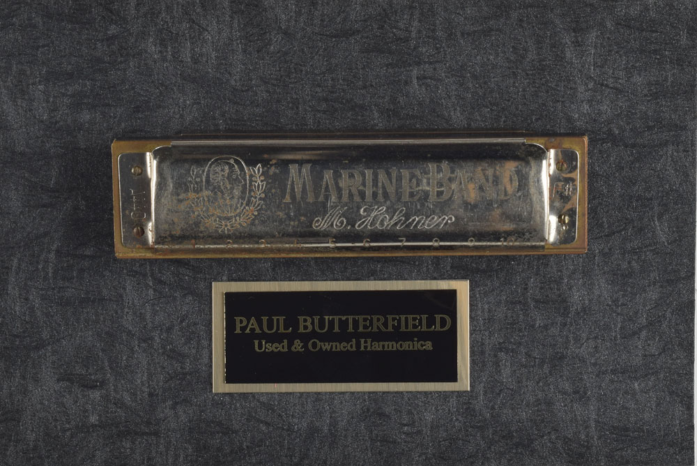 Paul Butterfield's personally-owned and -used Hohner Marine Band harmonica, measuring 4″ long, mounted on a mat board above a small engraved plaque, "Paul Butterfield, Used & Owned Harmonica." In fine condition, with expected signs of use. Accompanied by a photocopied letter of provenance from Butterfield's manager Frank Yandolino, in full: "I, Frank Yandolino was Paul Butterfield's personal manager. Paul gave me his harmonicas as a gift and they have been in my possession for many years."