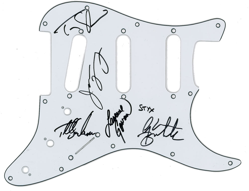 White Stratocaster-style pickguard, signed in black felt tip by five members of Styx, including Tommy Shaw and James Young. In fine condition.