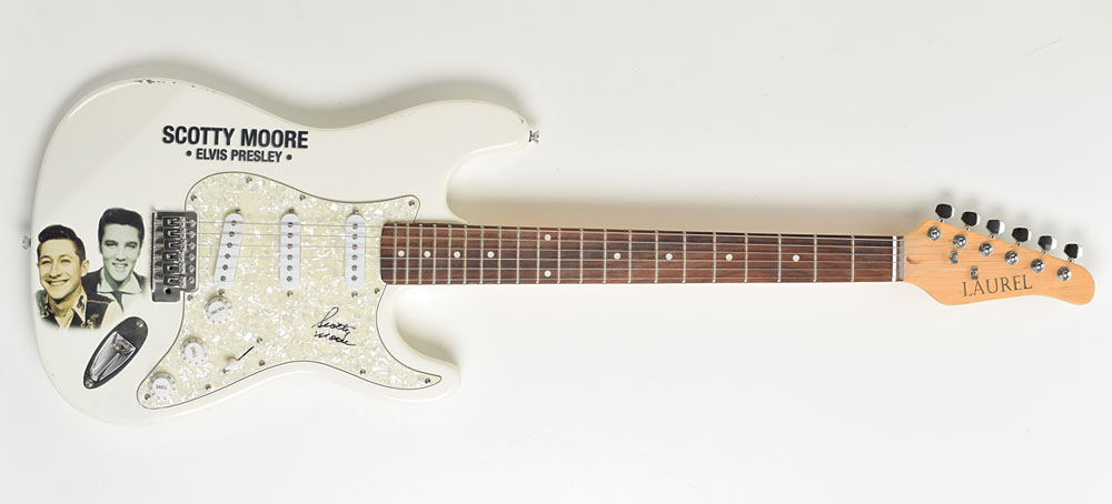 White-bodied Laurel Stratocaster-style electric guitar embellished on the body with imagery of Moore and Presley, signed on the pearloid pickguard in black felt tip, "Scotty Moore." In fine condition, with rubbing to the body, some of which has been lightly repaired.