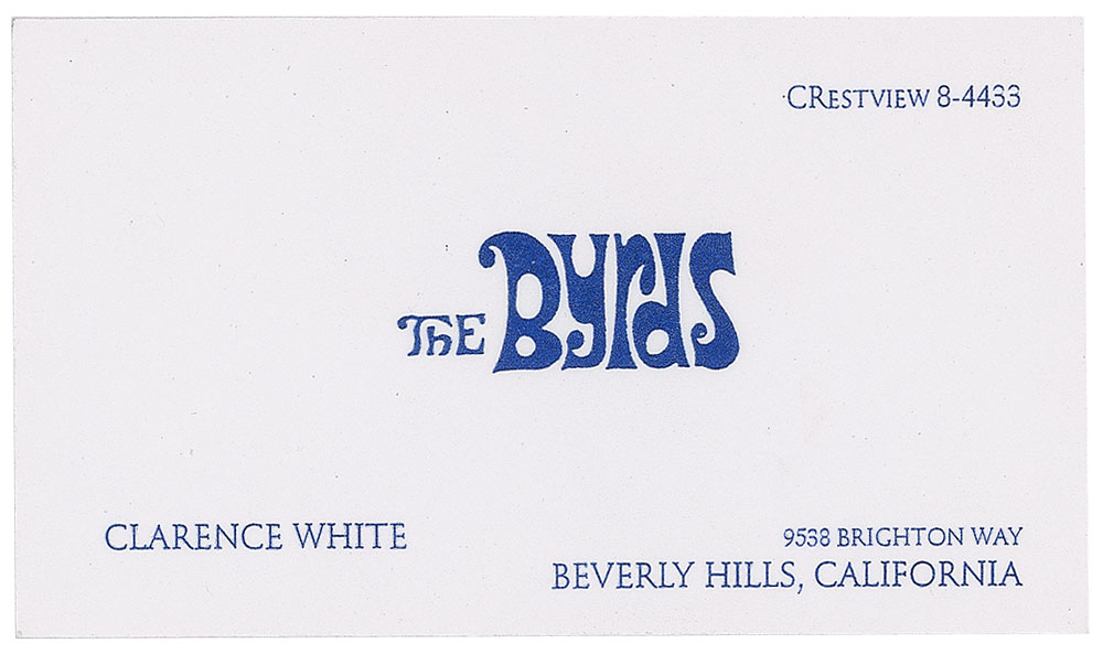 Scarce The Byrds business card belonging to Clarence White, 3.5 x 2, with lower portion listing White's name and address. In very fine condition.