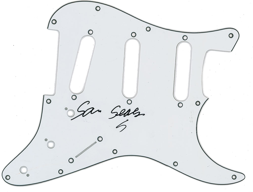 Chicago-based electric blues guitarist and singer (1942-2004) who began performing professionally at the age of 13; known for his intense and innovative guitar playing and his grainy singing voice, Seals played alongside other prominent blues musicians like Albert King, Rufus Thomas, Bobby Bland, Junior Parker, and Rosco Gordon. White Stratocaster-style pickguard sign in black felt tip by Son Seals. In fine condition.
