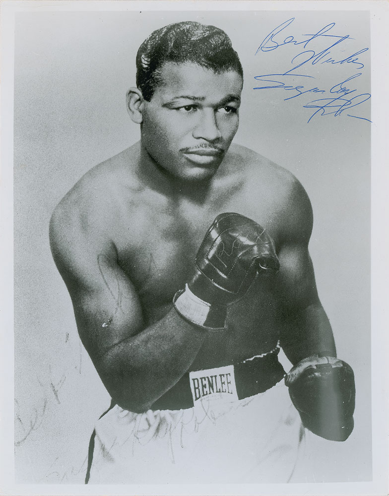 Glossy 8 x 10 photo of Sugar Ray in a pugilistic half-length pose, signed in blue ballpoint, "Best wishes, Sugar Ray Robinson." In very good to fine condition, with scattered light creasing and a faint vertical bend.