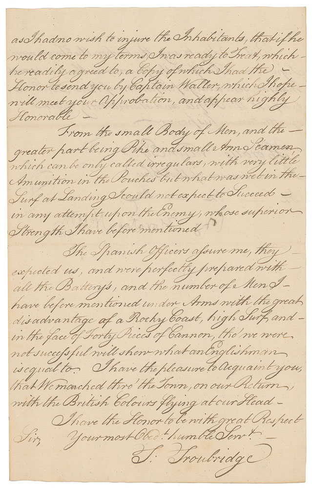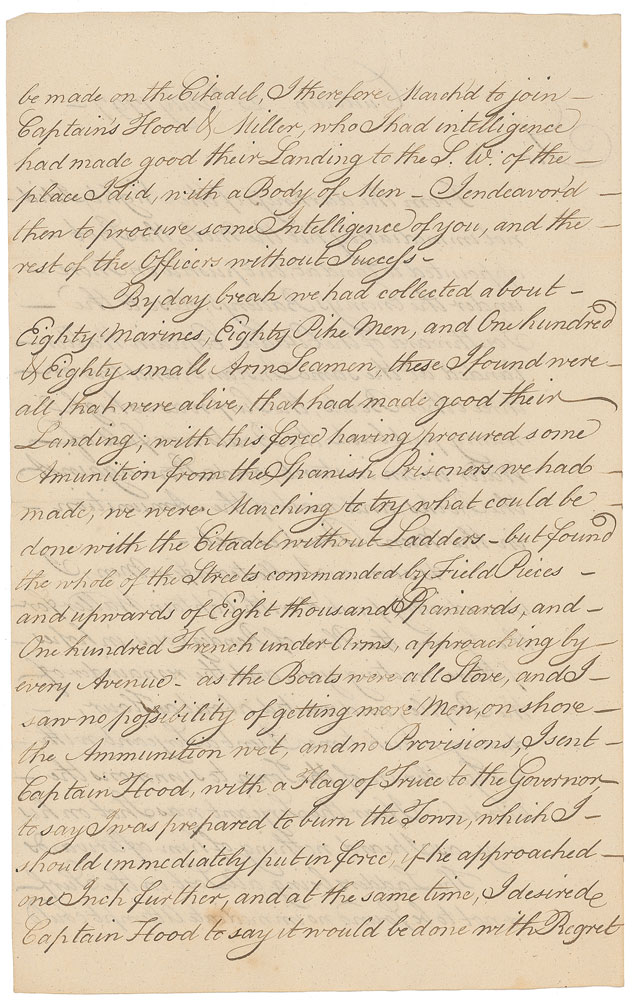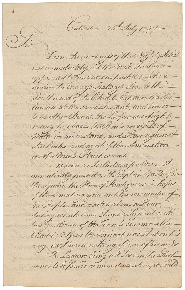LS endorsed at the conclusion, "Copy Horatio Nelson," four pages on two adjoining sheets, 8 x 12.5, July 25, 1797. An important manuscript copy of Captain Thomas Troubridge's account describing his attack on Santa Cruz, dated on board the HMS Culloden on the day of the battle. In part: "From the darkness of the Night, I did not immediately hit the mole, the Spot appointed to land, but push'd on Shore under the Enemy's Battery's, close to the Southward of the Citadel…I immediately push'd with Captain Waller for the Square, the Place of Rendezvous, in hopes of there meeting you…The Ladders being all Lost in the Surf or not to be found no immediate attempt could be made on the Citadel…I endeavour'd then to procure some Intelligence of you, and the rest of the officers without Success…By day break we had collected about Eighty marines, Eighty Pike Men, and One hundred & Eighty small Arm Seamen, these I found were all that were alive, that had made good their Landing…having procured some Amunition from the Spanish Prisoners we had made, we were Marching to try what could be done with the Citadel without Ladders…but found…upwards of Eight thousand Spaniards, and One hundred French under Arms, approaching by every Avenue; as the boats were all Stove, and I saw no possibility of getting more men on shore, the Ammunition wet, and no Provisions, I sent Captain Hood with a Flag of Truce to the Governor, to say I was prepared to burn the Town…at the same time, I desired Captain Hood to say, it would be done with Regret, as I had no wish to injure the Inhabitants, that if he would come to my terms, I was ready to Treat, which he readily agreed to…From the small Body of Men, and the greater part being Pike and small Arm Seamen, which can be only called irregulars, with very little Ammunition in the Pouches but what was wet in the Surf at Landing, I could not expect to Succeed in any attempt upon the Enemy, whose superior Strength I have before mentioned. The Spanish officers assure me, they expected us, and were perfectly prepared with all the Battery's, and the number of Men I have before mentioned under Arms with the great disadvantages of a Rocky Coast, high Surf, and in the face of Forty Pieces of Cannon, tho' we were not successful will shew what an Englishman is equal to. I have the pleasure to acquaint you, that We marched thro' the Town, on our Return, with the British Colours flying at our Head." Signed at the conclusion by Nelson, now forced to use his left hand, to certify it as an official copy to retain for his own records. Troubridge's original report is now in the Royal Navy College at Greenwich, England. In fine condition.