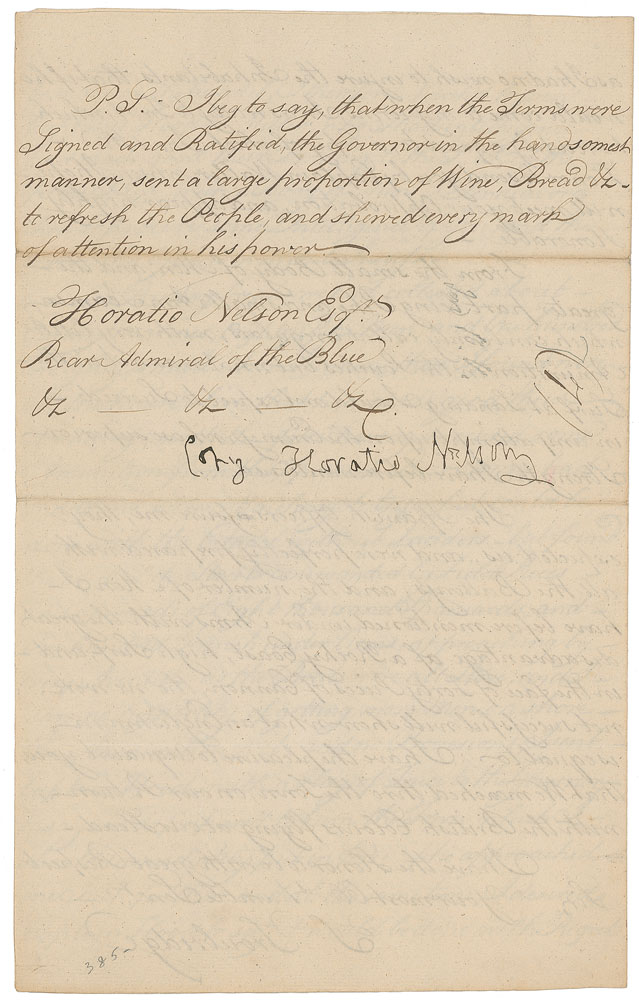 Admiral John Jervis ordered Nelson's squadron to capture the Spanish port city of Santa Cruz de Tenerife in the Canary Islands in an effort to incapacitate the larger Spanish navy. Nelson's assault plan began with Troubridge landing at Valle Seco beach under cover of night, stealthily disembarking to take the Spanish by surprise and capture their coastal batteries. Meanwhile, a British gunboat would attack from the sea, and Nelson would sweep in to capture Spanish merchant vessels and their cargo. The plan came to a halt during the first maneuver, as Troubridge's report describes—though he managed to land, their cover had been blown and strong currents prevented a safe arrival on the shore. Angered by this failure, Nelson decided to personally oversee the next attack which would be against the city itself. Anticipating this move, the Spanish commander Antonio Gutiérrez de Otero concentrated his forces in the port defenses which were centered on San Cristobal castle. Nelson and his attack force set out to move against the castle but again were spotted by a Spanish frigate and the harbor batteries opened fire. Under duress, the British ships struggled to reach the shore and one boat sunk in the crossfire. Just as Nelson reached land, he famously was hit in the right arm and taken back to his flagship, the HMS Theseus, where a surgeon amputated the injured limb. Within 30 minutes of the amputation, Nelson was again issuing orders and commanding his troops. Ultimately, the British forces failed to advance and Troubridge became trapped, thus his request for a truce. This historically important document must have been one of the first signed by Nelson with his left hand, just after losing his right arm in the chaos of battle, and is exceptionally desirable in that it was his own personal copy of the report. This piece is both historically important and holds great significance in the context of Nelson's biography and heroic legacy.