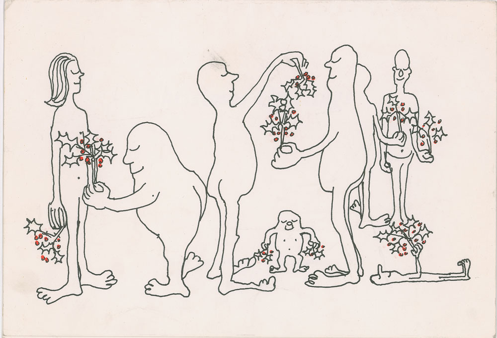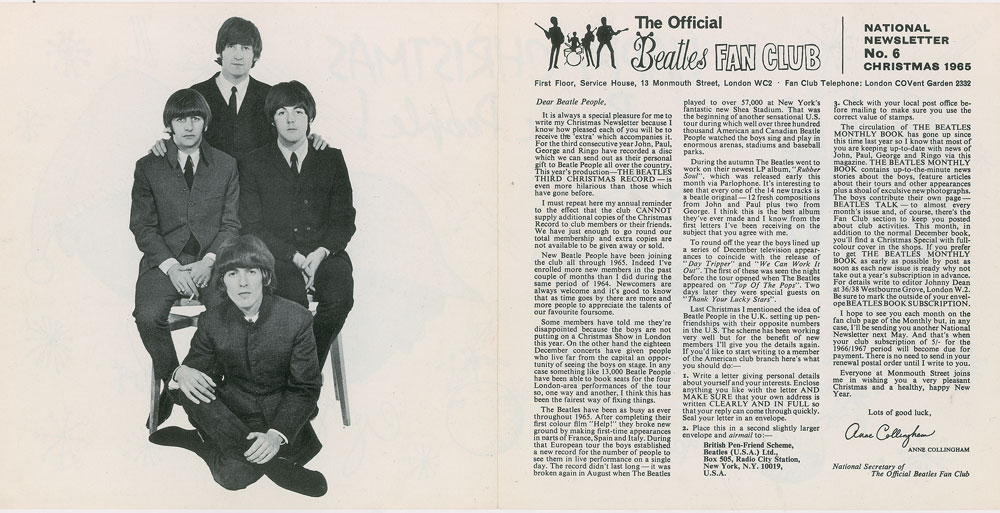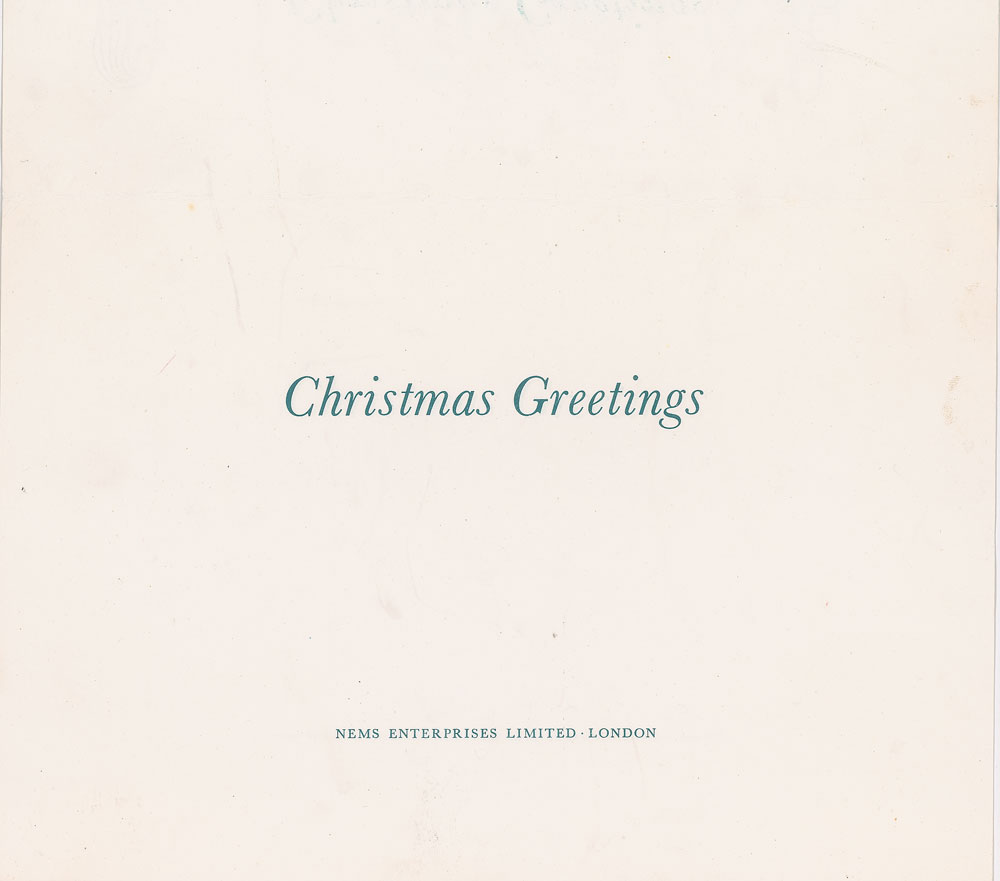 Two Beatles Christmas cards: an Official Beatles Fan Club newsletter from Christmas 1965, which opens to a 14 x 7 image of the group with their facsimile signatures, reading: "Happy Christmas, Beatle People!"; and a 10.5 x 7.25 NEMS Enterprises Christmas card, with the front reproducing a John Lennon sketch from the Christmas edition of In His Own Write. In fine condition.