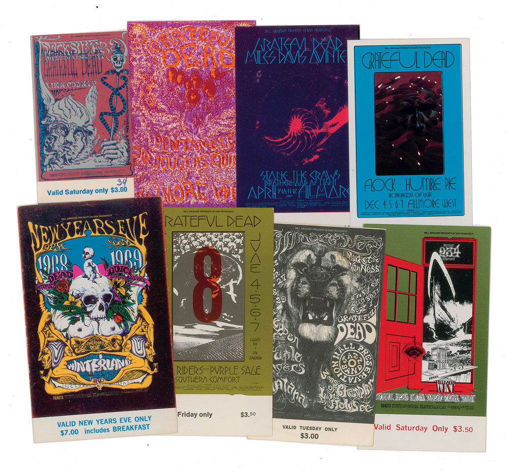 Group of eight original Grateful Dead tickets from the late 1960s and early 1970s, most for shows at the Fillmore West, all featuring the classic psychedelic poster artwork used to advertise the concerts. Shows and supporting acts include: Miles Davis; Pentangle and Sir Douglas Quintet; Flock and Humble Pie; Linn County; Blood, Sweat & Tears and Spirit; Steppenwolf, Staple Singers, and Santana; New Riders of the Purple Sage and Southern Comfort; and New Year's Eve at Winterland with the Grateful Dead, Quicksilver Messenger Service, Santana, and It's A Beautiful Day. In overall fine condition.