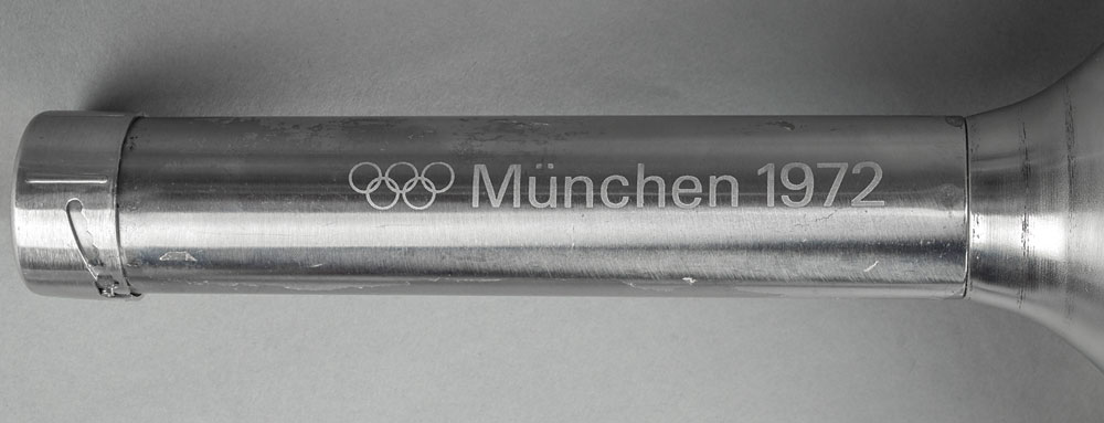 Official 1972 Munich Olympics torch, comprised of metal and steel, measuring 29″ in length and 8.5″ at its widest, designed by Friedrich Krupp AG. The torch bears Olympic rings and the inscription “Spiele der XX Olympiad, Munchen 1972” on its handle, with the name of the designer engraved on the bottom. The Munich Games emblem designs a platform at the base of the combustion tube. Some scuffing and marks to handle. Traveling a shade over 5,500 km over the course of 30 days, roughly 6,000 torchbearers were used to reach and light the Olympic flame at the opening ceremony on August 26, 1972. A coveted artifact commemorating Germany’s stalwart role in international sport.
