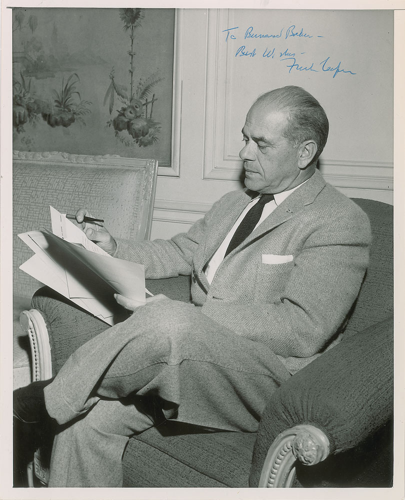 Vintage glossy 8 x 10 photo of the Oscar-winning filmmaker seated with a cigarette and looking over paperwork, signed and inscribed in blue ballpoint, "To Bernard Baker—Best wishes—Frank Capra.” In fine condition, with a few small creases and surface impressions.
