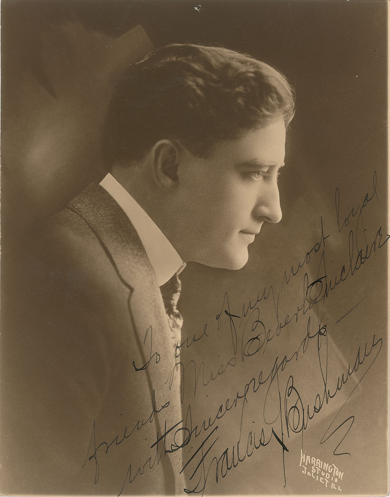 American silent film actor and director (1883-1966) who is best remembered for his role as Messala in the 1925 epic Ben-Hur. Vintage matte-finish 7.25 x 9.25 photo of Bushman in a haunting profile pose by the Harrington Studio of Joliet, Illinois, signed and inscribed in fountain pen, "To one of my most loyal friends, Miss Beverly Sinclair, with sincere regards—Francis X. Bushman.” In fine condition, with trimmed edges.