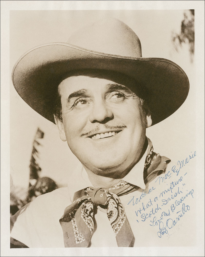 Vintage matte-finish 8 x 10 close-up photo of Carrillo wearing a cowboy hat and bandana, signed and inscribed in blue ballpoint, “To dear Mac and Marie, What a mixture—’Scotch-Irish,’ Love and Blessings, Leo Carrillo,” with the impressions of the date “2-11-59” below. In very good to fine condition, with moderate rippling along the edges.