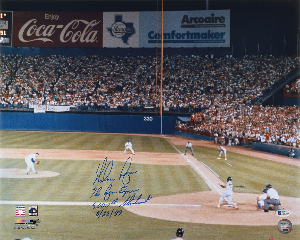 Color satin-finish 20 x 16 photo of Ryan recording his 5,000th strikeout against Rickey Henderson, prominently signed in blue felt tip, "Nolan Ryan, The Ryan Express, 5,000th Strikeout, 8/22/89." In fine condition, with a Beckett label affixed to the lower right corner. Accompanied by a certificate of authenticity from Beckett Authentication Services.