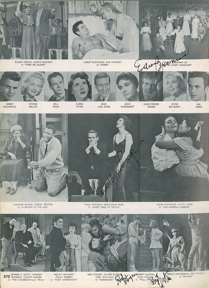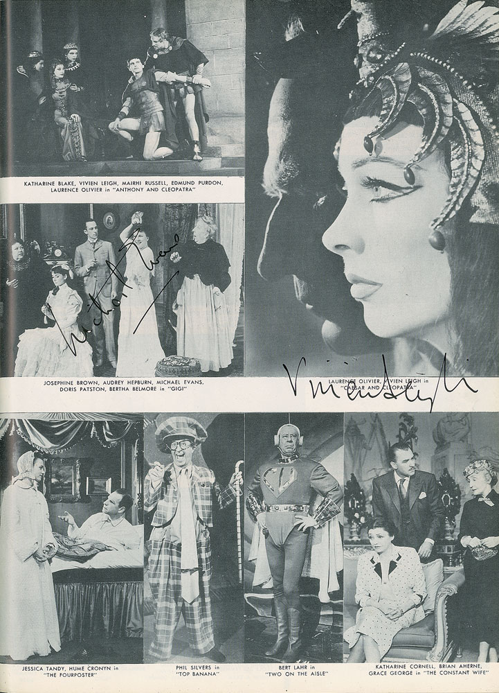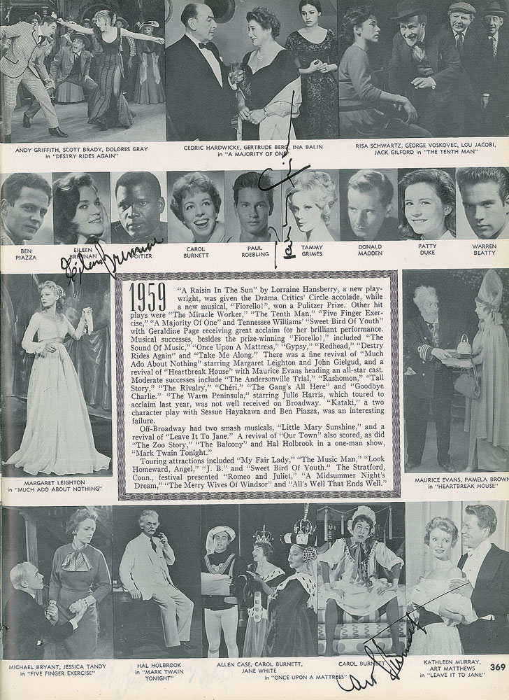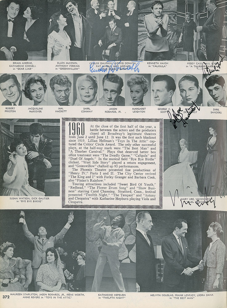 Signed book: A Pictorial History of the American Theatre: 100 Years—1860-1960. NY: Bonanza Books, 1960. Hardcover, 9.25 x 12.5, 384 pages. Signed inside in ink or fountain pen over 100 times by 69 classic performers and producers of the American stage, including: Vivien Leigh (2), John Alexander, Richard Arlen, Orson Bean (2), Sidney Blackmer, Vivian Blaine (3), Eileen Brennan, Carol Burnett (2), Kitty Carlisle (5), Jack Cassidy, Carol Channing, Claudette Colbert, Barbara Cook (2), Elisha Cook, Jr. (2), Denise Darcel, Howard Da Silva, Jack Dempsey, Colleen Dewhurst, Ludwig Donath, Robert Drivas, Jimmy Durante (2), Robert Elston, Faye Emerson, Michael Evans, Mary Fickett, Paul Ford (2), Arlene Francis, Eva Gabor, Betty Garrett (2), Larry Gates, Marjorie Gateson (2), Jack Gilford, Hermione Gingold (2), Dorothy Gish (11), Ruth Gordon, Tammy Grimes, Carol Haney, Russell Hardie (5), Frances Heflin, Van Heflin (2), Anne Jackson, Conrad Janis, Walter Kerr, Judson Laire, Paula Laurence, Howard Lindsay, Paul Lukas, Gordon MacRae, Mary Martin (2), Darren McGavin, Kay Medford (2), Julie Newmar, Nancy Olson, Geraldine Page (3), Jane Pickens (2), Christopher Plummer (2), William Prince, Cyril Ritchard (2), Buddy Rogers, Sylvia Sidney, Patricia Smith, Lionel Stander, Rod Steiger, Dorothy Stickney, Susan Strasberg, Sophie Tucker, Rudy Vallee, Dick Van Patten, and Nancy Walker. In very good to fine condition, with damage to the spine and wear to the slightly loose covers; inner pages are all fine and clean.