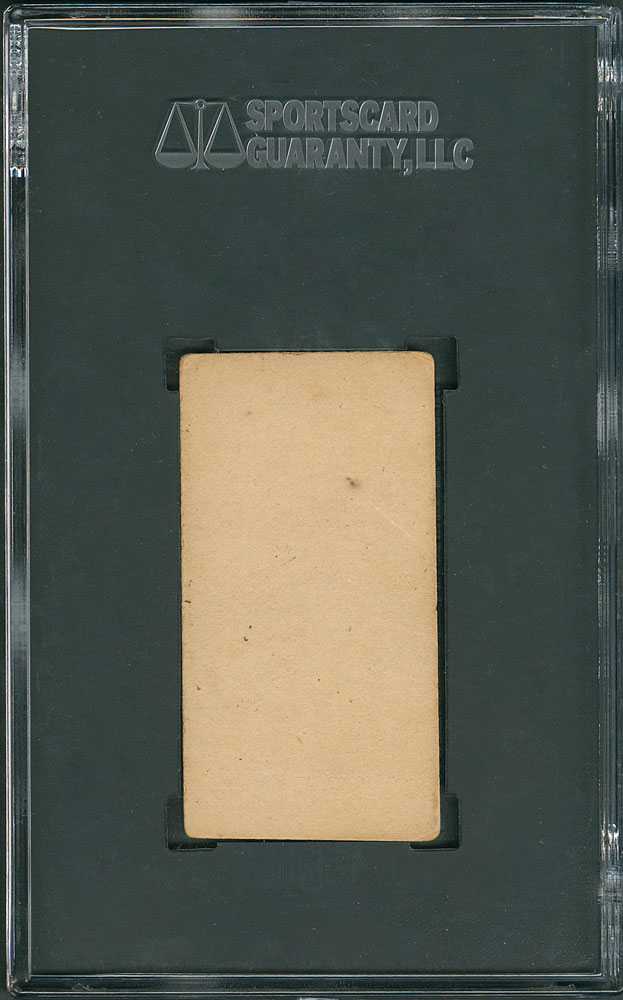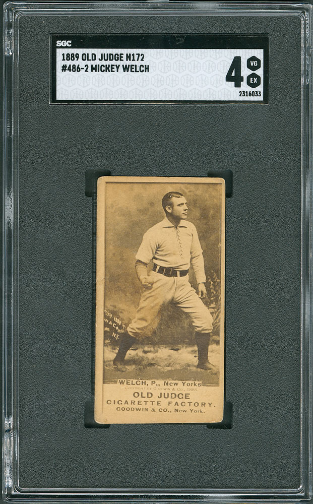 Graded by SGC VG-EX 4. Superb image of the Hall of Fame right hander, in the familiar right hand at right thigh pose. More so than any other baseball card issue, desirability of Old Judge baseball cards are based on the focus, brightness and contrast of the photo. This Welch example, graded by SGC at VG-EX 4 has a MINT 9 print quality, with tremendous contrast where virtually every detail is clearly seen. Evenly rounded corners and a small print blemish result in the technical grade, however, nothing can diminish the superb image.