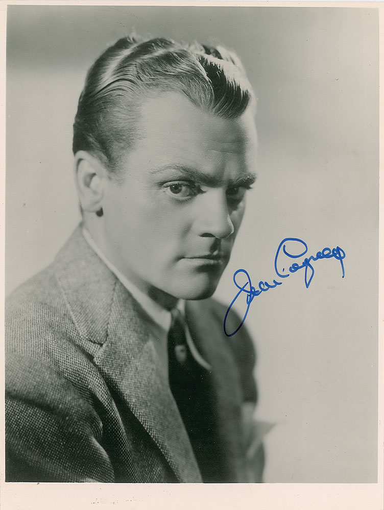 Excellent matte-finish 7.5 x 10 close-up portrait of James Cagney, signed in blue felt tip. In very fine condition, with lightly trimmed borders.