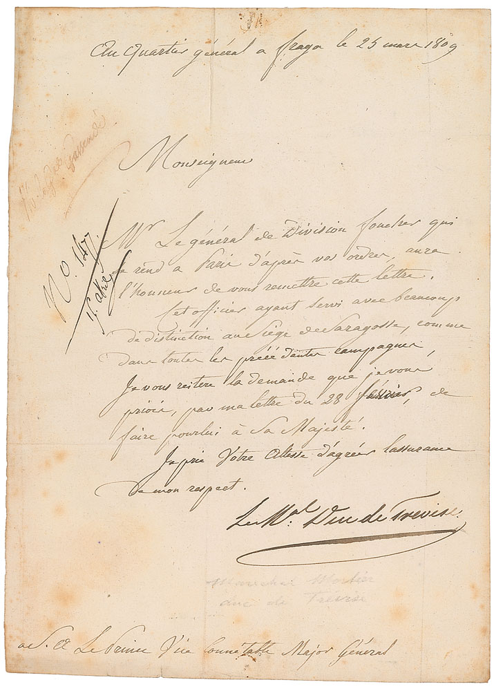 French general and marshal of France under Napoleon (1768-1835) who was made duke of Treviso in 1808. LS in French, signed “Le M'al Duc de Trevise,” one page, 8.5 x 11.75, May 25, 1809. Letter to Prince Berthier, in part (translated): "General Foucher, who is going to Paris according to your orders, will have the honor of handing you this letter. This officer having served with great distinction at the Siege of Zaragoza, as in all the preceding campaigns, I repeat to you the request that I will ask you by my letter of February 28, to do for him to His Majesty." In fine condition, with scattered light toning.