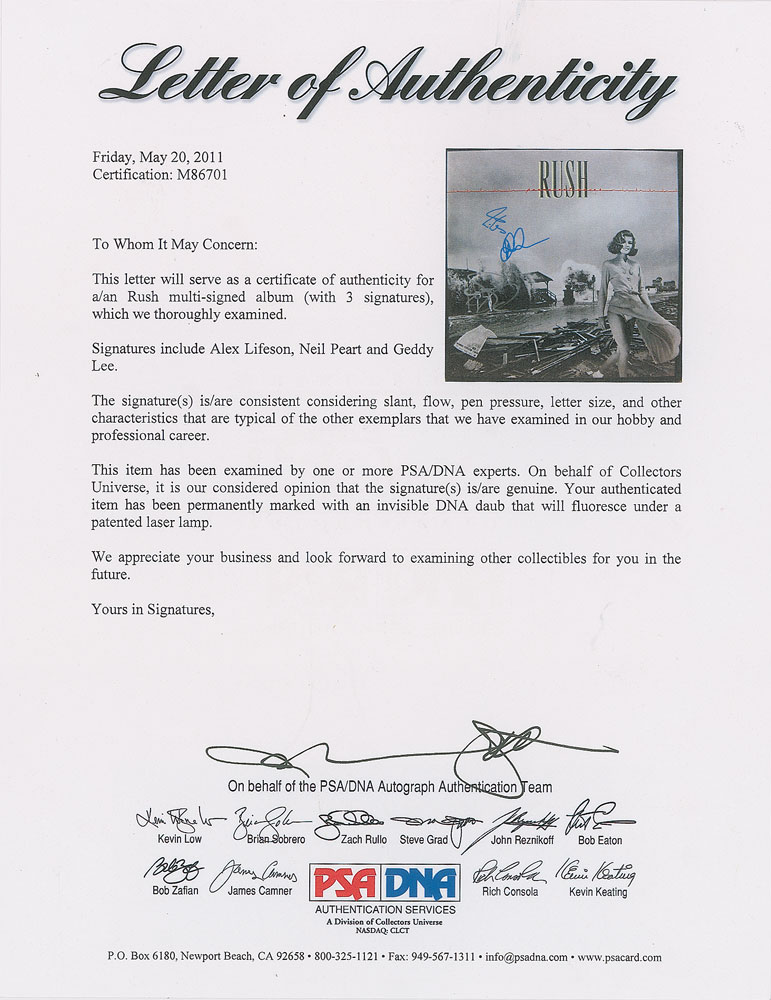 Permanent Waves album signed on the front cover in silver ink by Geddy Lee, and in black felt tip by Alex Lifeson and Neil Peart. In fine condition, with tape to edges of back cover. The record is not included. Accompanied by full letters of authenticity from REAL and PSA/DNA.
