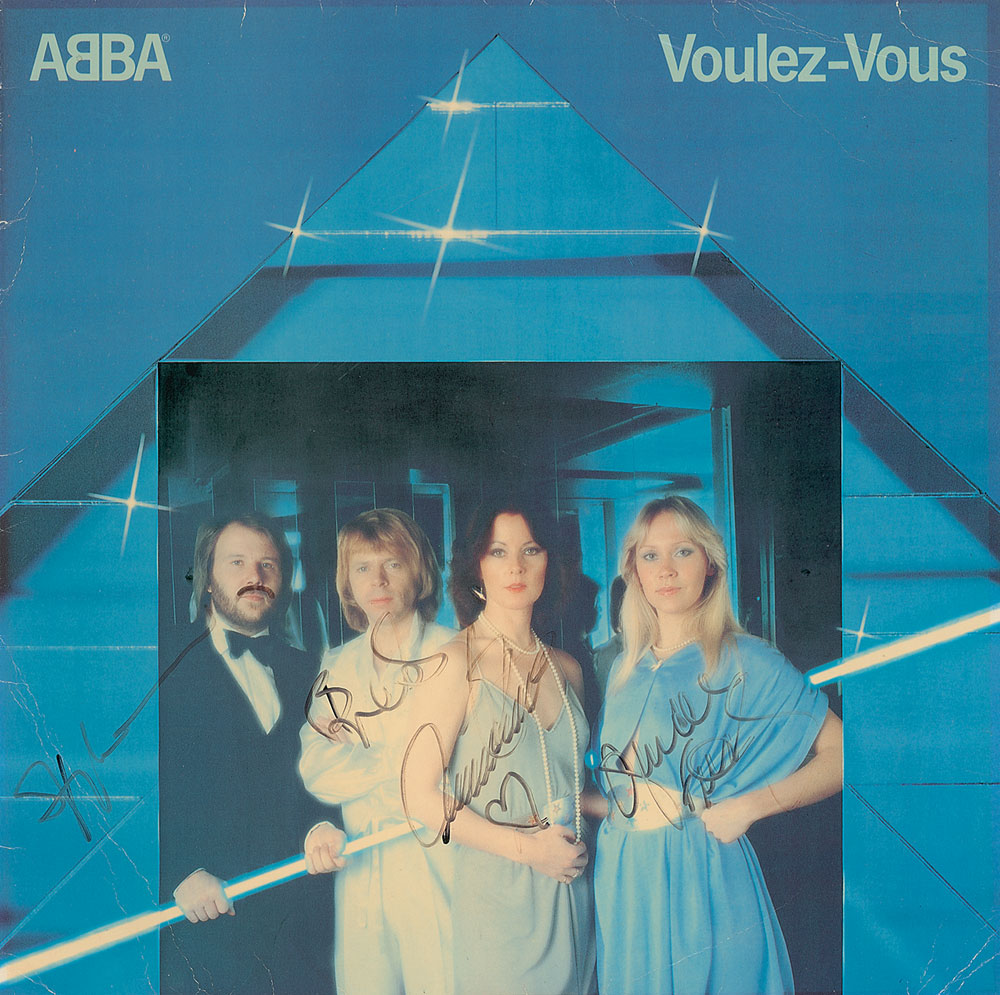 Voulez-Vous album signed on the front cover in black felt tip by Benny Andersson, Agnetha Faltskog, Frida Lyngstad, and Bjorn Ulvaeus, all signing first names only. In very good to fine condition, with creasing to the edges and corners, and separation along the bottom edge. The record is not included.