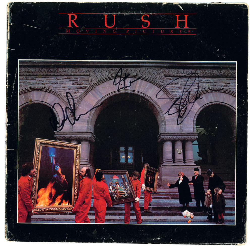 Moving Pictures album signed on the front cover in black felt tip by Geddy Lee, Alex Lifeson, and Neil Peart. In very good condition, with light scuffing, creasing, and edge wear. The record is not included. Accompanied by a full letter of authenticity from REAL.
