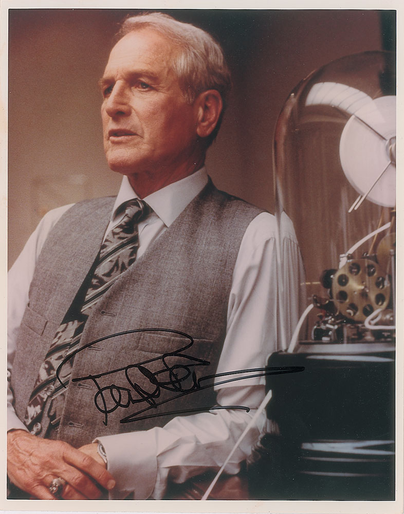 Color glossy 8 x 10 photo of Paul Newman as Sidney J. Mussburger from the 1994 film The Hudsucker Proxy, signed in black felt tip. In fine condition. From The John Brennan In-person Autograph Collection.