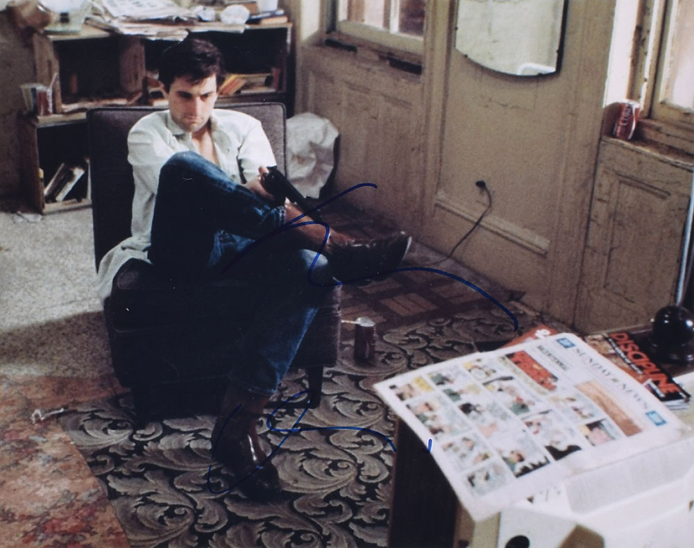 Color satin-finish 14 x 11 full-length photo Robert of De Niro as Travis Bickle pointing a gun in the 1976 film Taxi Driver, signed in blue felt tip. In very good condition, with overall light creases. From The John Brennan In-person Autograph Collection.