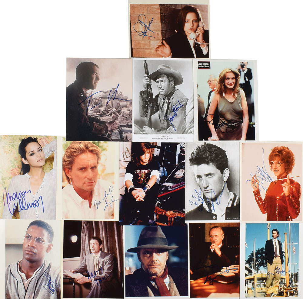 Fantastic collection of 14 glossy photos of Oscar-winning actors and actresses, each approximately measuring 8 x 10 or 10 x 8, each signed in blue or black felt tip by the pictured Academy Award recipient: Marion Cotillard, Michael Douglas, Jodie Foster, Tom Hanks, Dustin Hoffman, Anthony Hopkins, Jared Leto, Jack Nicholson, Gary Oldman, Gregory Peck, Sean Penn (ins), Julia Roberts, James Stewart, and Denzel Washington. In overall fine condition. From The John Brennan In-person Autograph Collection.