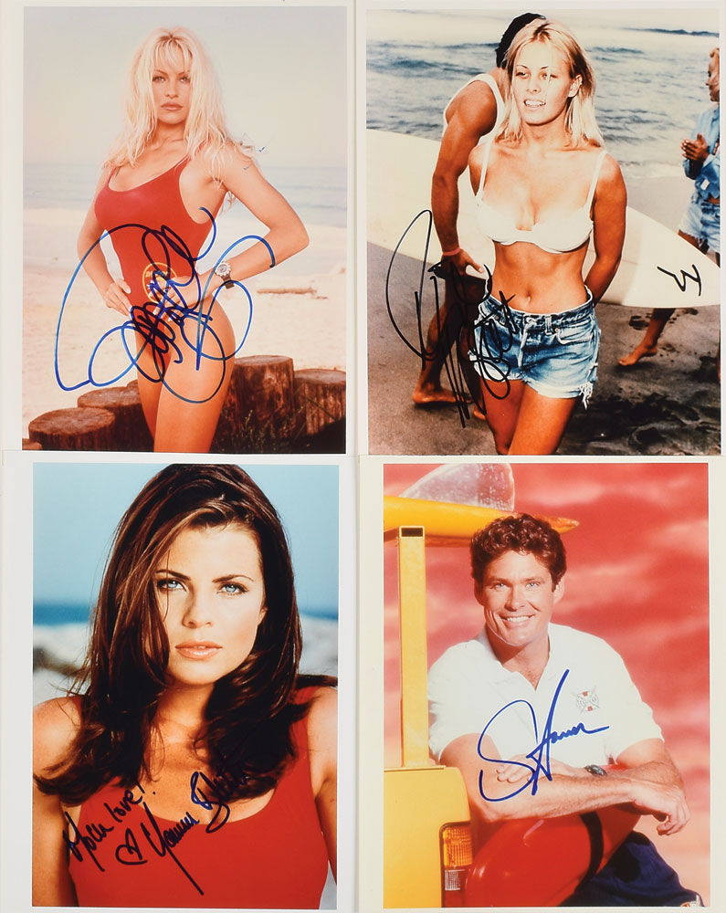 Four color glossy 8 x 10 photos of stars from the lifeguard television drama Baywatch, each signed in blue or black felt tip by the pictured actor or actress: Pamela Anderson, Yasmine Bleeth, Nicole Eggert, and David Hasselhoff. In overall fine condition. From The John Brennan In-person Autograph Collection.