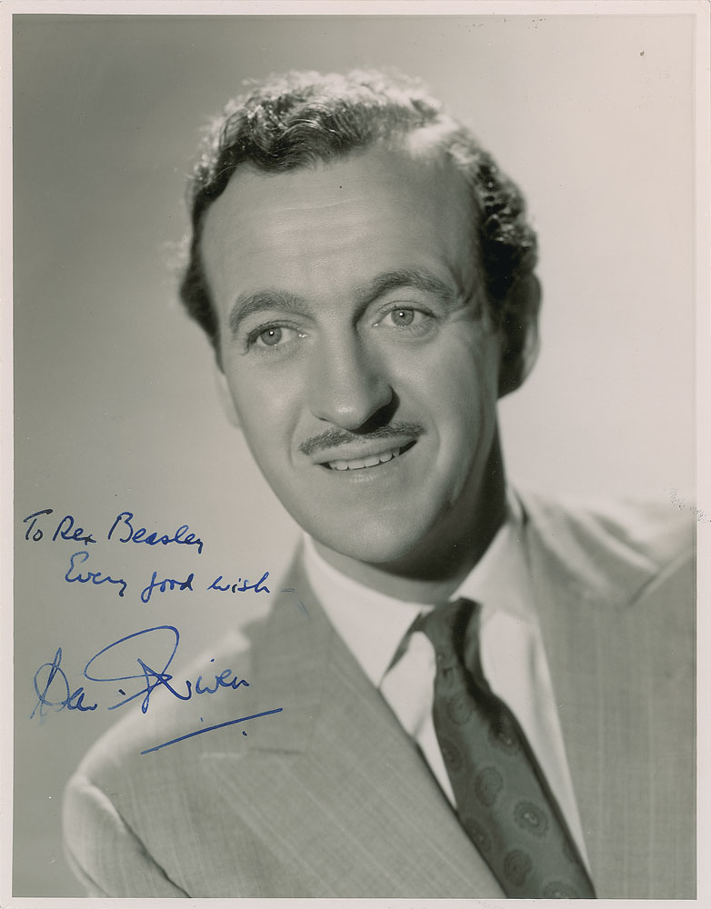 Vintage glossy 7.75 x 10 portrait of Niven in a suit and tie, signed and inscribed in fountain pen, "To Rex Beasley, Every good wish—David Niven.” Reverse bears a Frank Buckingham credit stamp. In fine condition, with a few small surface creases.