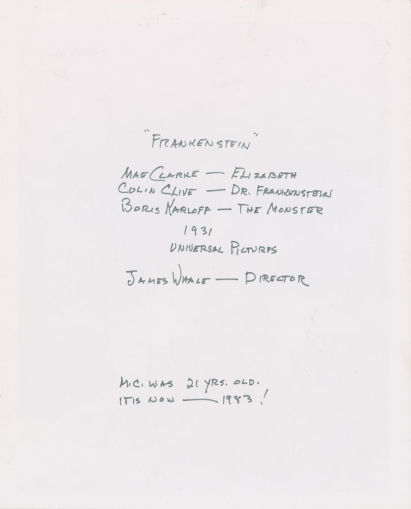 Uncommon glossy 8 x 10 photo of Clarke as the bride of Henry Frankenstein in the classic horror film, signed and inscribed in black felt tip, "To Pauline Tominack, Greetings, Mae Clarke, 1983.” On the reverse, Clarke has written a Frankenstein cast list, adding: "M.C. was 21 yrs. old. It is now—1983!" In fine condition, with light surface streaking, visible only at an angle.