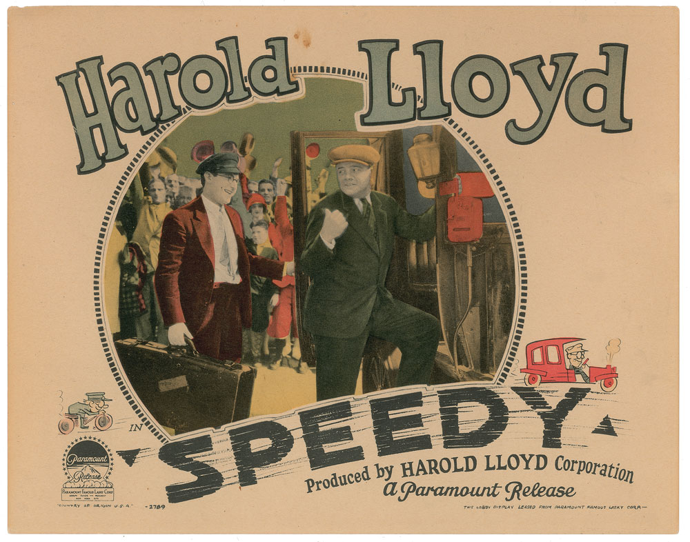 Superb vintage glossy 10 x 8 photo of Babe Ruth posing next to comedic actor and filmmaker Harold Lloyd, signed boldly in fountain pen by the legendary ballplayer. In very good to fine condition, with scattered surface creasing, a bit heavier in the bottom border. Accompanied by an original color Paramount Pictures 14 x 11 lobby card for the 1928 silent film Speedy, which shows an image of Lloyd opening an automobile door for the Yankee slugger. Ruth plays himself in a small part in Speedy, accepting a taxi ride from Lloyd who drives Ruth to Yankee Stadium in record time. A fantastic uninscribed offering ideal for display.