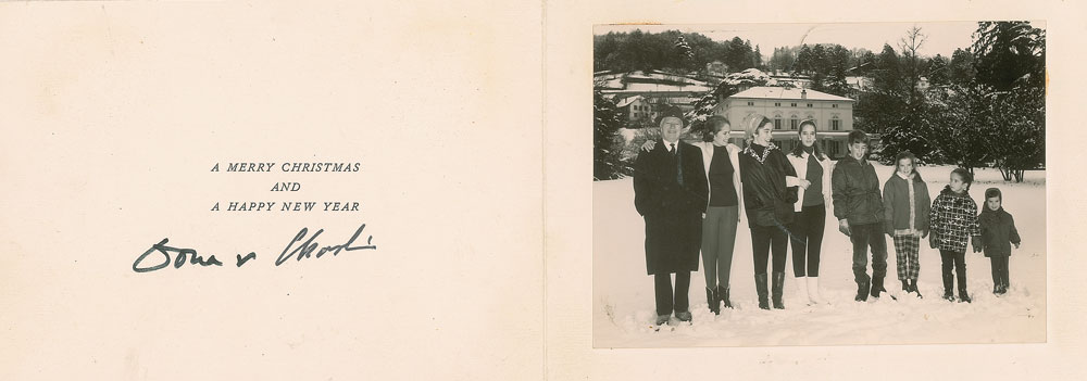 Uncommon Christmas and New Year's card, measuring 13.25 x 4.75 open, featuring a matte-finish photo of Charlie Chaplin posing with his wife Oona and six of their eight children—Josephine, Victoria, Eugene, Jane, Annie, and Christopher—posing together in a wintry setting, signed on the adjacent page in black felt tip, "Oona &" and "Charlie." The photo is no longer affixed to the card. In fine condition, with old mounting residue on the back of the card.