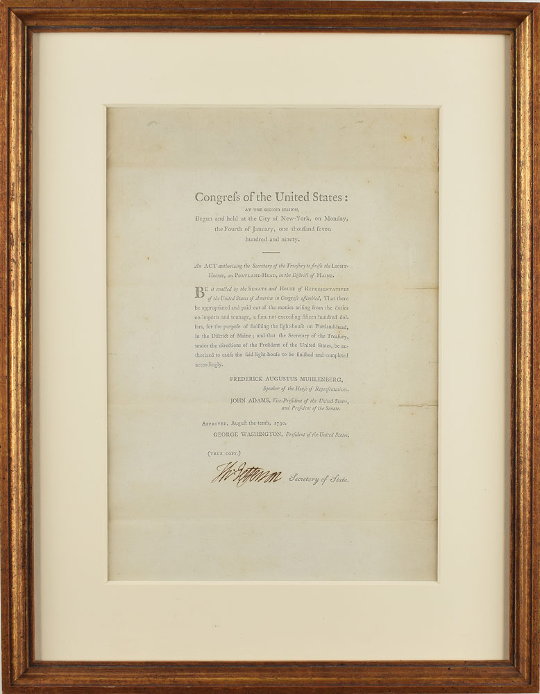 Superb DS, signed “Th: Jefferson,” one page, 9.5 x 13.75, August 10, 1790. Secretary of State Jefferson certifies "An Act authorizing the Secretary of the Treasury to finish the Light-House, on Portland-Head, in the District of Maine," appropriating a sum not exceeding $1,500 "for the purpose of finishing the light-house on Portland-head, in the District of Maine; and that the Secretary of the Treasury, under the directions of the President of the United States, be authorized to cause the said light-house to be finished and completed accordingly." Boldly and prominently signed at the conclusion by Jefferson; the document also bears the printed approvals of Speaker of the House Frederick Augustus Muhlenberg, Vice President John Adams, and President George Washington. Handsomely matted and framed to an overall size of 15.5 x 19.75. In fine condition, with light soiling, and splitting to two of the fold ends.
