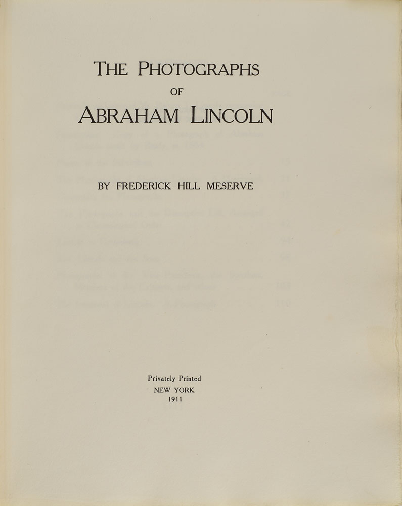 Rare book: The Photographs of Abraham Lincoln by Frederick Hill Meserve. Limited edition, numbered 21/102. NY: Privately-printed, 1911. Hardcover, 9.25 x 11, 111 pages. Signed on the colophon by the author, "F. H. Meserve." The book reproduces the then-known photographs of Abraham Lincoln, consisting of 74 pages of text plus tipped-in silver print photographs struck from the original negatives in the Meserve Collection. The photographs are arranged by topic: The Photographs of Abraham Lincoln (100), Lincoln at Gettysburg (3), Mrs. Lincoln and the Sons (4), Photographs of the Vice-Presidents, the Speakers, Members of the Cabinet and Others (12), and The Interment of Lincoln (1). In fine condition, with wear to spine and board edges; all tissue guards are present and without stains or foxing, and the deckle-edge pages are likewise bright and crisp. Accompanied by a deluxe custom-made clamshell case. An exquisite compendium of photographs of Lincoln that is rarely available today.