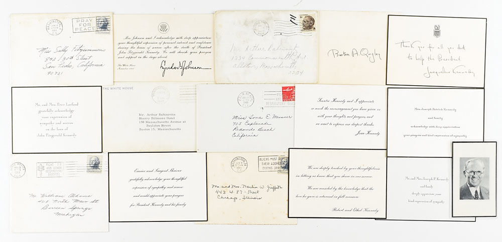 Uncommon assemblage of seven ‘appreciation’ or ‘thank you’ cards sent to well wishers following the death of President John F. Kennedy on November 22, 1963, with all but one of the cards sent by a member of the Kennedy family, including: Jacqueline Kennedy, bearing a preprinted message addressed to “Burton A. Quigley,” with the original secretarially signed envelope; Lyndon and Lady Bird Johnson, bearing a preprinted signature of the president, with White House mailing envelope postmarked December 2, 1963; Joseph and Rose Kennedy, with hand-addressed mailing envelope postmarked December 23, 1963; Robert and Ethel Kennedy, with hand-addressed mailing envelope postmarked January 11, 1964; Joan Kennedy on behalf of her husband Senator Ted Kennedy; Peter Lawford and Patricia Kennedy, with hand-addressed mailing envelope postmarked December 23, 1963; and Eunice and Sargent Shriver, with hand-addressed mailing envelope postmarked January 14, 1964. Also includes an ‘appreciation’ card from Rose Kennedy in regard to the recent passing of her husband, Joseph P. Kennedy, with hand-addressed mailing envelope postmarked January 1970, and a laminated prayer card from the funeral service. In overall fine condition.