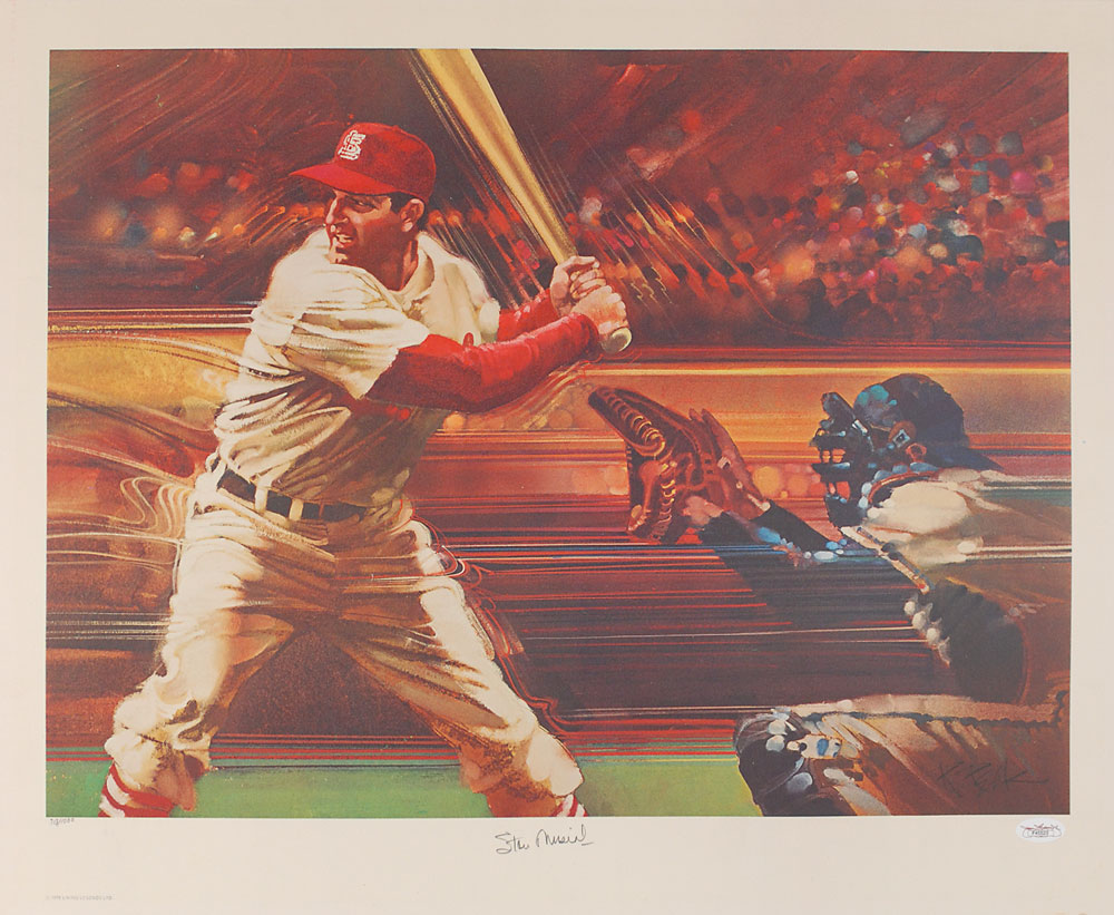 Color limited edition 22 x 18 print of a vibrant depiction of Stan Musial at bat, numbered 713/1000, signed in the lower border in pencil. In fine condition, with a JSA label affixed to the lower right. Accompanied by a certificate of authenticity from JSA. These difficult-to-find prints were issued in the 1970s by Sports Illustrated.
