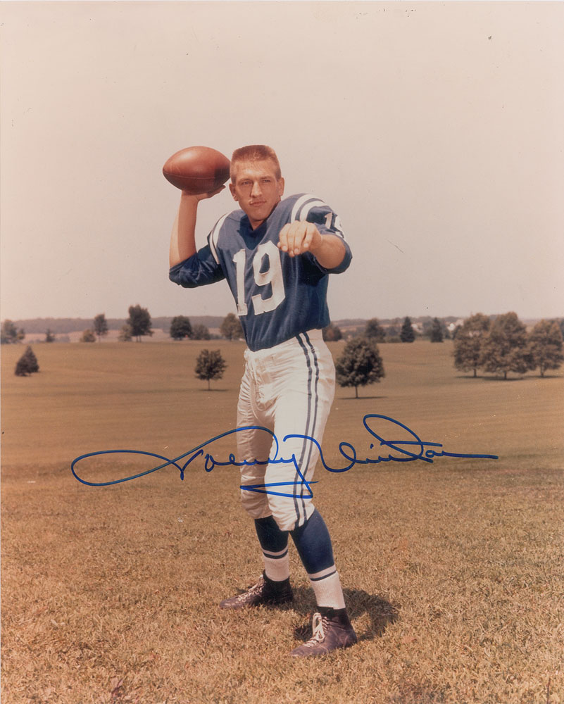 Two color glossy 8 x 10 photos of the record-setting quarterback for the Baltimore Colts, both signed in blue felt tip by Johnny Unitas. In overall fine condition.