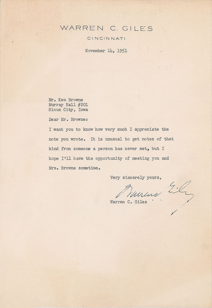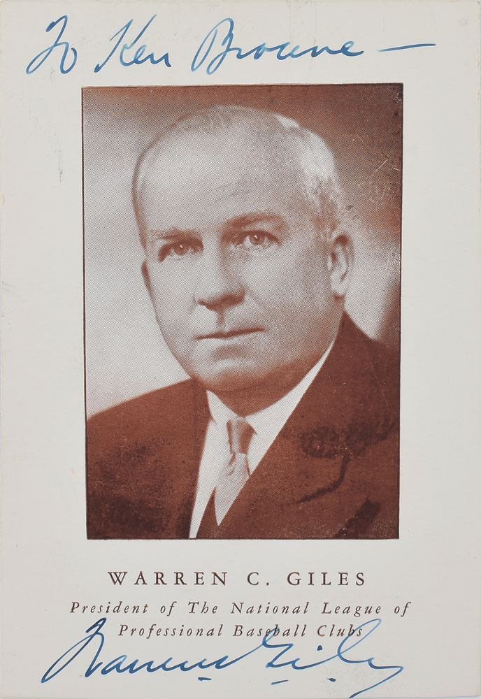 Group of three items signed by National League President Warren Giles, including a TLS, a small cardstock photo, and a fountain pen signature on an off-white card. In overall very good to fine condition, with some creasing to the letter.