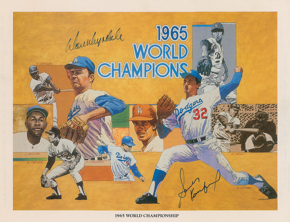 Color 11 x 8.5 paperstock print showing the 1965 world champion pitching duo, issued as a promo by the Union 76 gas station, signed in ink by Sandy Koufax and Don Drysdale. In fine condition, with mild handling creases.