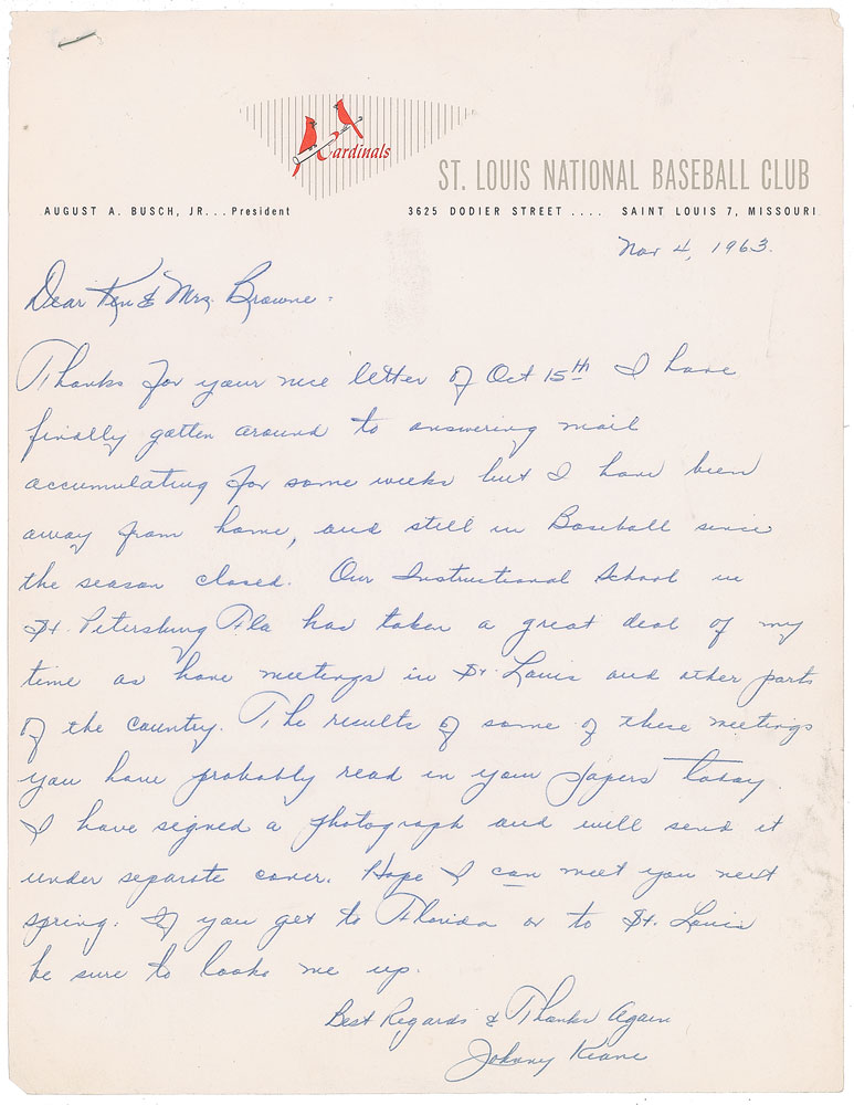 Baseball manager (1911-1967) who helmed the St. Louis Cardinals from 1961-1964 and New York Yankees from 1965-1966; in 1964, his Cardinals made an epic comeback in the last two weeks of the season en route to the World Series championship. Two items: a vintage glossy 8 x 10 photo of Keane in his St. Louis Cardinals uniform, signed in blue ballpoint, "Best wishes, Johnny Keane"; and an ALS, one page, St. Louis National Baseball Club letterhead, November 4, 1963, in part: "Our Instructional School in St. Petersburg Fla. has taken a great deal of my time as have meetings in St. Louis and other parts of the country. The results of some of these meetings you have probably read in your papers today. I have signed a photograph and will send it under separate cover." In very good to fine condition, with scattered creasing to the photo. Accompanied by the original mailing envelope for the letter.