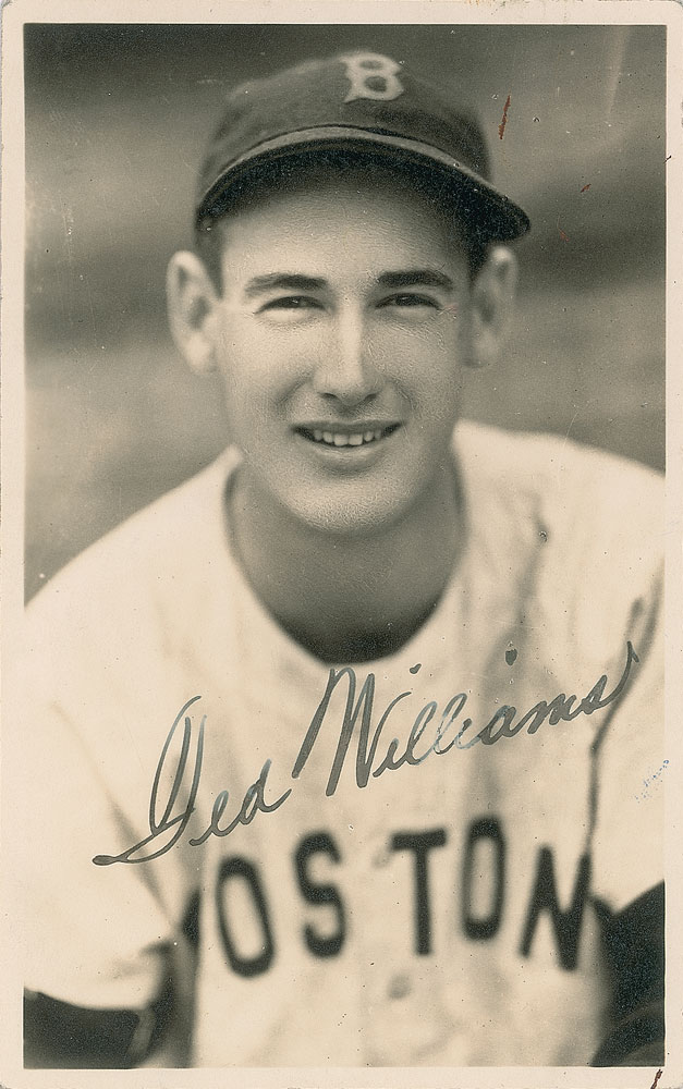Very early vintage matte-finish 3.5 x 5.5 photo of Williams in his Boston Red Sox uniform by renowned baseball photographer George Burke, neatly signed in fountain pen. In very good to fine condition, with a paperclip impression to the top edge, and some silvering under the brim of his cap.