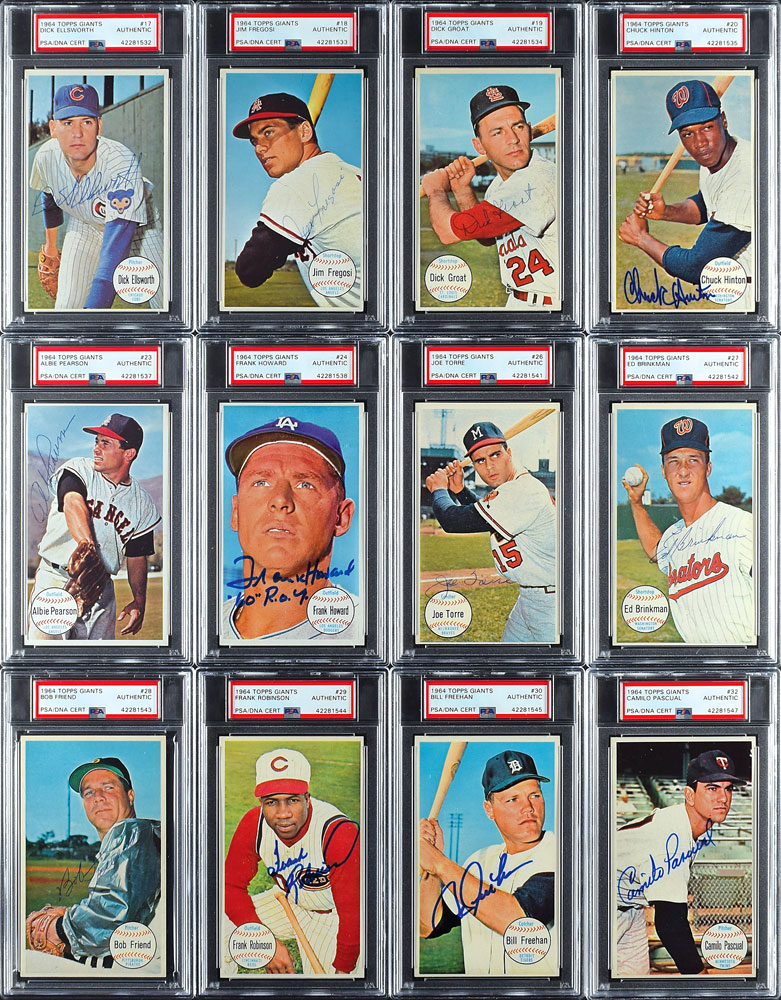 The 1964 Topps Giants baseball card set appears to have been 'made for autographs.' The large postcard size format features a large head shot of the player with ample room for signatures. While Clemente is certainly the most valuable, there are other key rarities within. One of the toughest is #22 Dick Farrell. After Farrell retired from baseball in 1969, he moved to England and was almost inaccessible to collectors seeking his signature. Other keys include early deceased players such as Nelson Fox, Ken Boyer, Elston Howard and Vada Pinson.