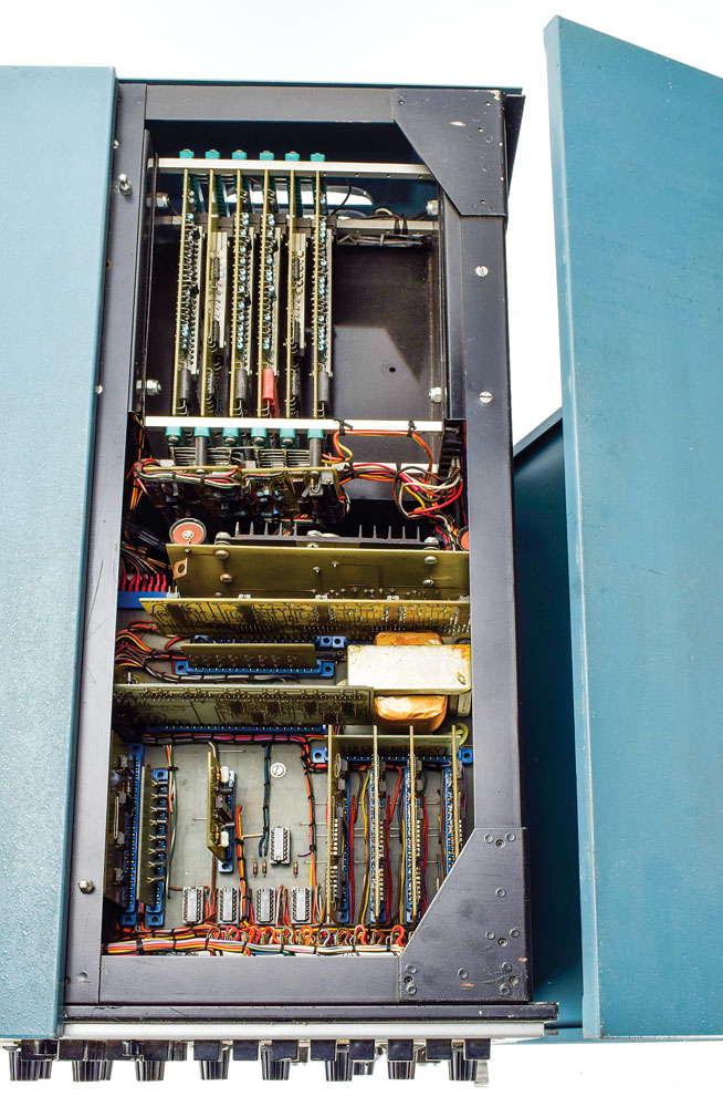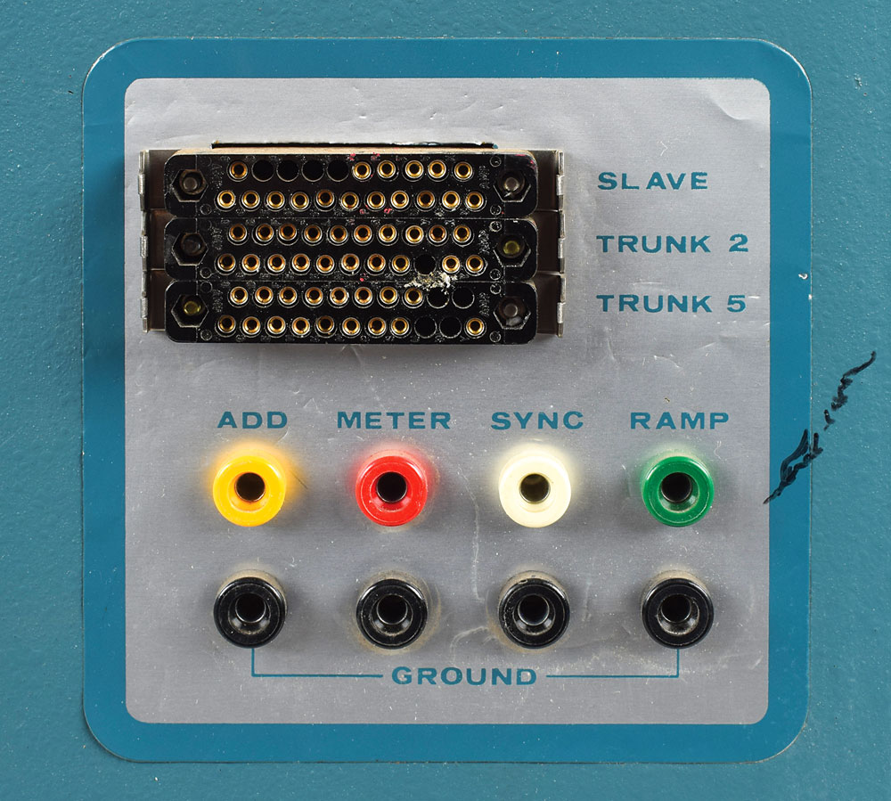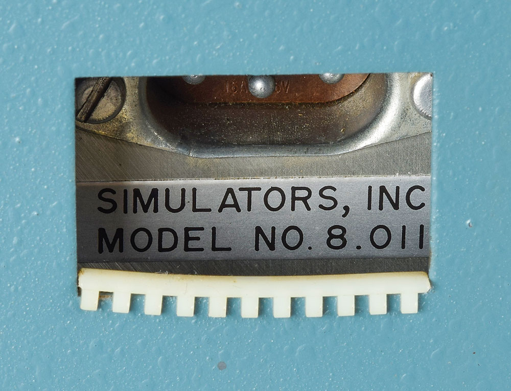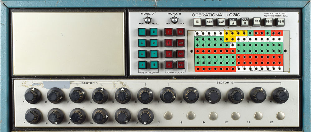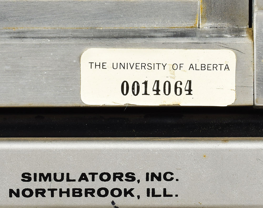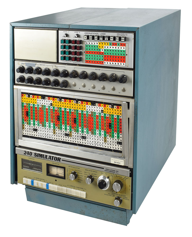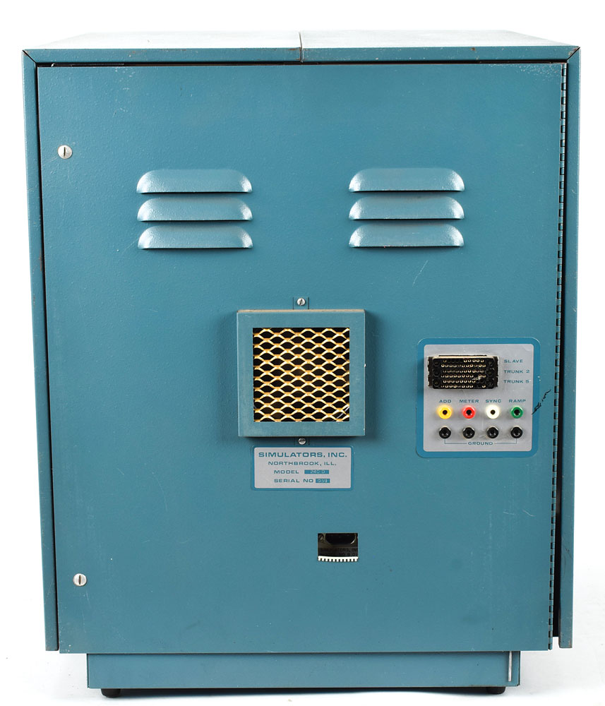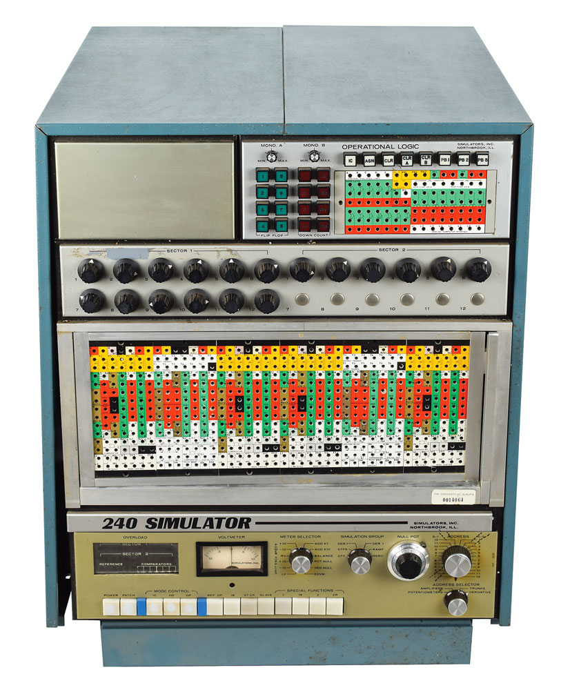 240 Simulator analog computer made by Simulators, Inc. of Northbrook, Illinois. The main 240 Simulator unit measures 20 x 26 x 22, and features colorful patch panels, knobs, and buttons on the front, as well as an integrated voltmeter. Includes an external patch panel, measuring 16 x 15.75 x 5.5, with colorful ports on the front and two trunk cables to the back, which connect to the back of the main unit. Untested and in very good to fine cosmetic condition, with the bar reading "240 Simulator" loose but present.