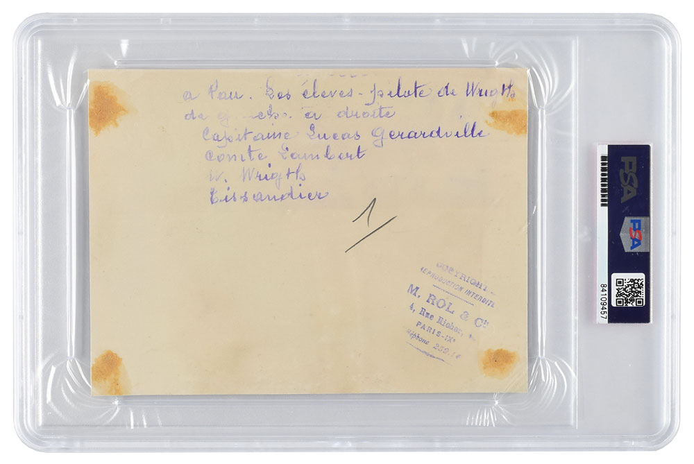 Original vintage matte-finish 6.5 x 5 photograph of Wilbur Wright with Captain Paul N. Lucas-Girardville, Charles de Lambert, and Paul Tissandier in Pau, France, where the Wright Brothers trained these three pioneering French pilots. Reverse bears a caption in French and an M. Rol & Cie. copyright stamp. Encapsulated by PSA and certified as an authentic "Type I" photograph. In fine condition, with trimmed edges.